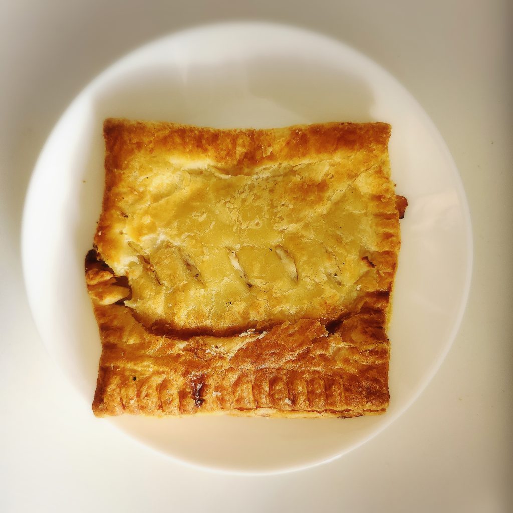 最后介绍的这个面包叫千层饼。这个饼不具备面包的外形,很像中国的饼。面皮比较酥脆,中间分层,一层或者多层,应该还有黄油,里面放着馅料。我还是比较喜欢吃这个的,有时把他当作早午餐或者来不及的时候,从超市买一块热乎的,方便又好吃。